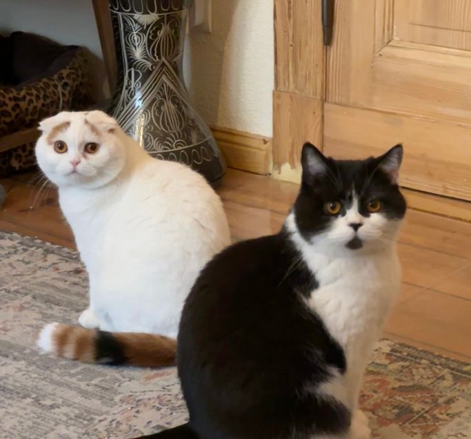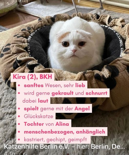 Alina (4) ist eine sanfte, ruhige Britisch Kurzhaar-Dame mit sehr schönen Bernsteinaugen. Sie liebt Nähe von Menschen, aber beobachtet auch gerne alle und alles. Kira (2) ist ganz zart und verspielt, lieb und schnurrt aus vollem Herzen. Sie liebt die Aufmerksamkeit von ihren Menschen und hat wird sehr gerne gestreichelt.