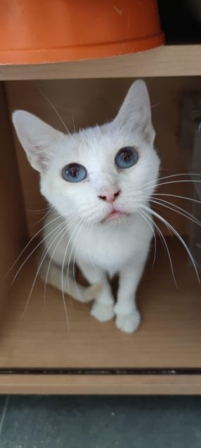 Elli und Peaches wurden vor der Haustür einer freiwilligen Mitarbeiterin ausgesetzt und befinden sich nun im Tierheim. Elli ist eine freundliche junge Katze, die sich mit weiteren Katzen und auch Hunden gut versteht. Sie soll idealerweise zusammen mit ihrem inzwischen blinden Kitten Peaches in Vermittlung gehen. Peaches hatte eine starke Augeninfektion was am Ende zur Entfernung beider Augäpfel geführt hat.