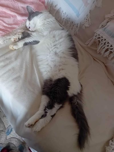 Im Grunde hätte das hübsche Geschwisterpärchen mit Sicherheit ganz schnell ein Zuhause finden können, wenn sie in die Vermittlung gekommen wären, als sie noch klein waren, aber leider hat Sofia sich sehr viel Zeit gelassen, bevor sie uns überhaupt mitgeteilt hat, dass die beiden existieren beziehungsweise dass sie sie bei sich aufgenommen hat. Und danach hat es dann noch länger gedauert, bis sie uns das erste und bislang einzige Mal Fotos und Videos von ihnen geschickt hat. Da waren die beiden leider schon fast ein Jahr alt und entsprechend groß. Und obwohl die Fotos nicht sehr gut geworden sind, zumal während der Aufnahmen sich Ramul das Gesicht dreckig gemacht hat von Katzenfutter, und ich um weitere Bilder gebeten hatte, sind bislang keine gekommen (Stand: 10.12.2025). Da die beiden gelieferten Fotos von Ramul fast identisch aussehen, zeige ich hier nur eines davon und stattdessen noch einen Screenshot aus einem der Videos, damit man auch seine spezielle Rückenzeichnung bestaunen kann.