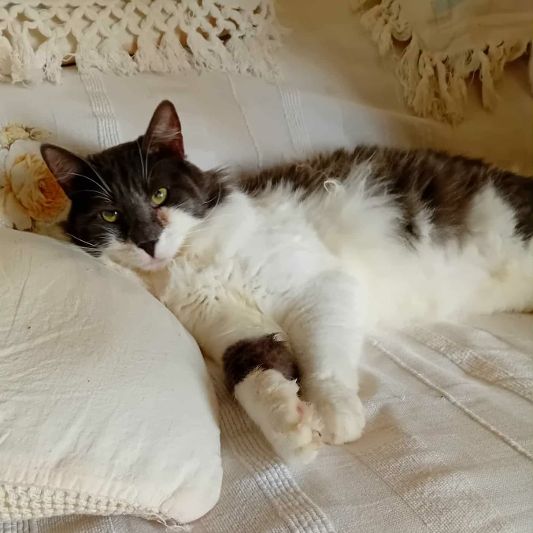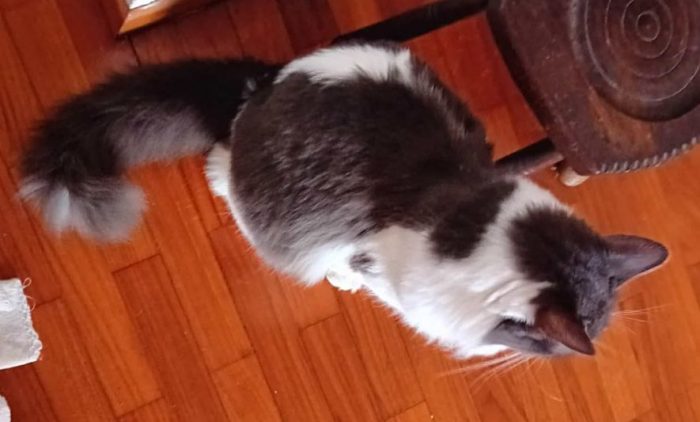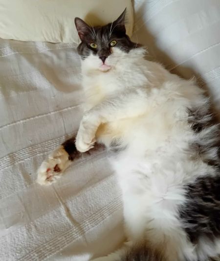 Im Grunde hätte das hübsche Geschwisterpärchen mit Sicherheit ganz schnell ein Zuhause finden können, wenn sie in die Vermittlung gekommen wären, als sie noch klein waren, aber leider hat Sofia sich sehr viel Zeit gelassen, bevor sie uns überhaupt mitgeteilt hat, dass die beiden existieren beziehungsweise dass sie sie bei sich aufgenommen hat. Und danach hat es dann noch länger gedauert, bis sie uns das erste und bislang einzige Mal Fotos und Videos von ihnen geschickt hat. Da waren die beiden leider schon fast ein Jahr alt und entsprechend groß. Und obwohl die Fotos nicht sehr gut geworden sind, zumal während der Aufnahmen sich Ramul das Gesicht dreckig gemacht hat von Katzenfutter, und ich um weitere Bilder gebeten hatte, sind bislang keine gekommen (Stand: 10.12.2025). Da die beiden gelieferten Fotos von Ramul fast identisch aussehen, zeige ich hier nur eines davon und stattdessen noch einen Screenshot aus einem der Videos, damit man auch seine spezielle Rückenzeichnung bestaunen kann.